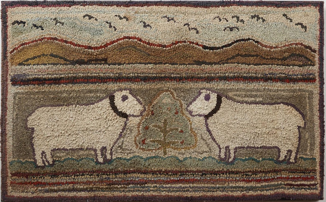 First rug depicts the animal all rug hookers love, sheep. It is also easy on the eyes; 2 sheep rug circa 1900 which measures 28 x 44.