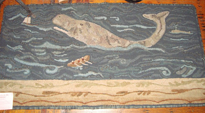 This humongous whale rug is Caroline's also and she explained how she hooked the water, but also said the whale was hooked higgly piggly.